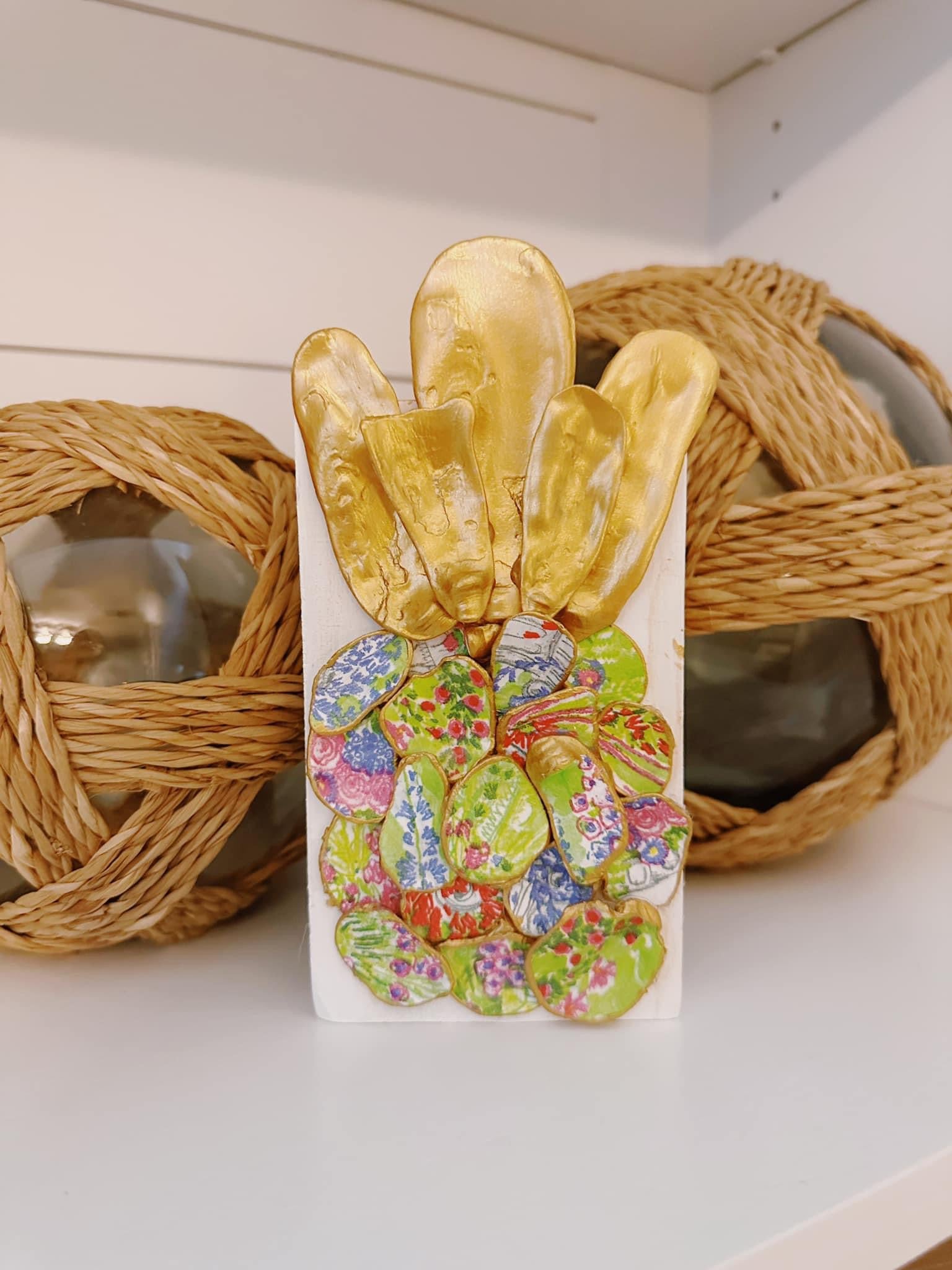 Looking for a unique and tropical decor item? Look no further! Our green pineapple, delicately crafted from oyster shells, will add a touch of color and charm to any space. Let this playful pineapple bring a sense of relaxation and fun to your home.