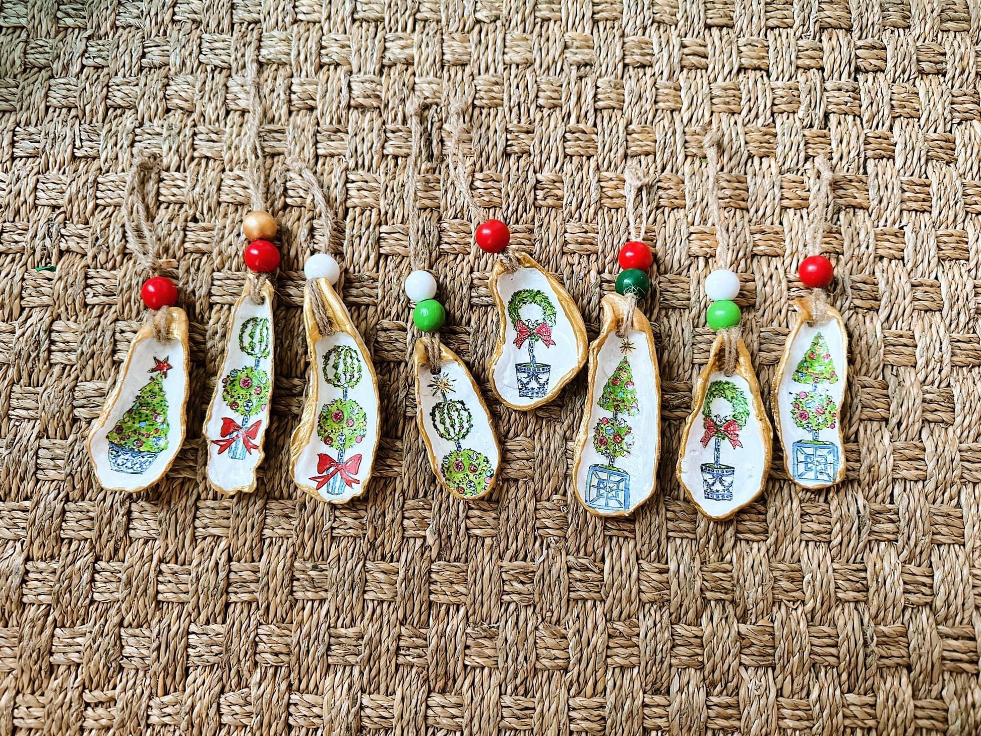 Add a unique touch to your holiday decor with our Christmas Topiary Ornaments. Made from oyster shells, these ornaments feature different topiary designs. Elevate your tree or home decorations with these one-of-a-kind pieces that are sure to stand out.