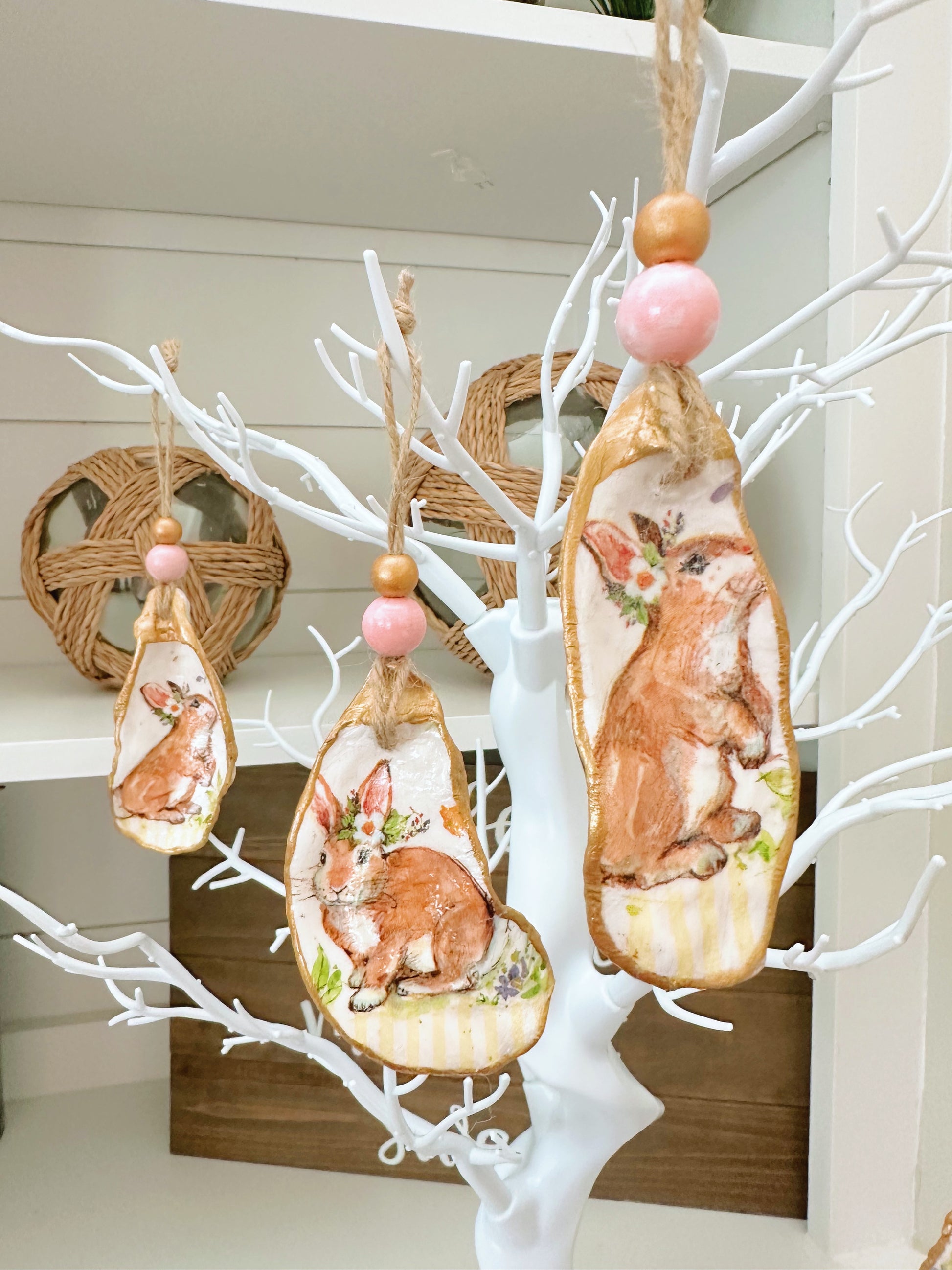 These charming Easter bunny ornaments will add a sweet touch to your holiday decorations. Handmade with love, each ornament is crafted from oyster shells, making it a unique and whimsical addition to your home. Make your Easter celebration even more special with these cute decorations. These come packaged in an adorable brown box with a bow.