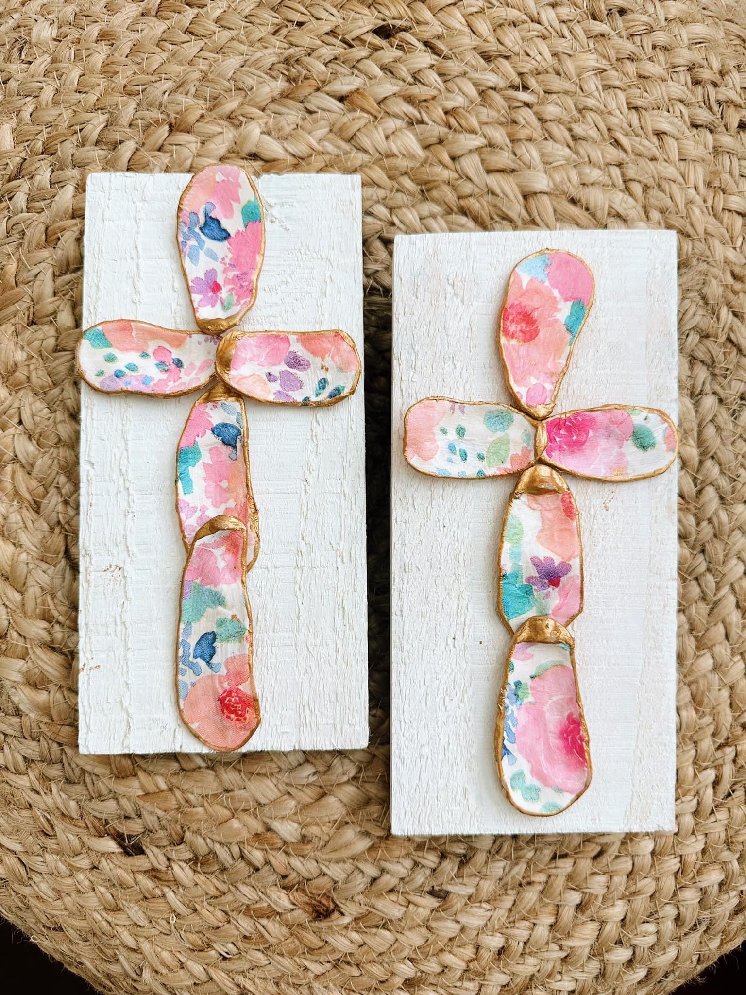 Experience God's grace through this stunning Medium Pink Floral Patterned Cross. Made of delicate oyster shells, its intricate design adds a touch of beauty to any space. Let it serve as a reminder of the power and beauty of God's love.