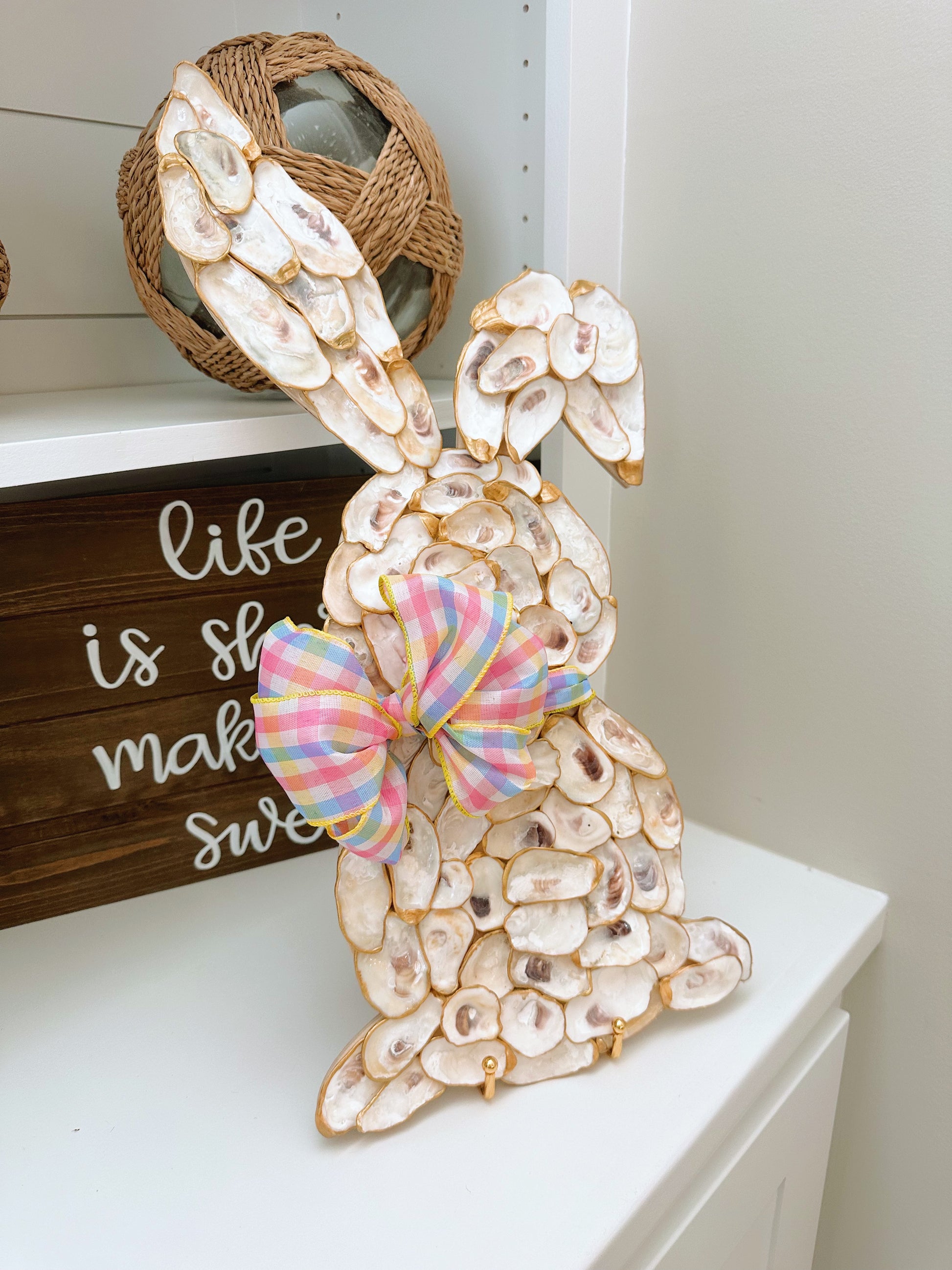 Introducing the Oyster Bunny - a one of a kind Easter bunny made entirely of oyster shells. This unique piece is sure to bring a sweet and charming touch to your holiday decor. Give the gift of a beachy Easter with the Oyster Bunny.