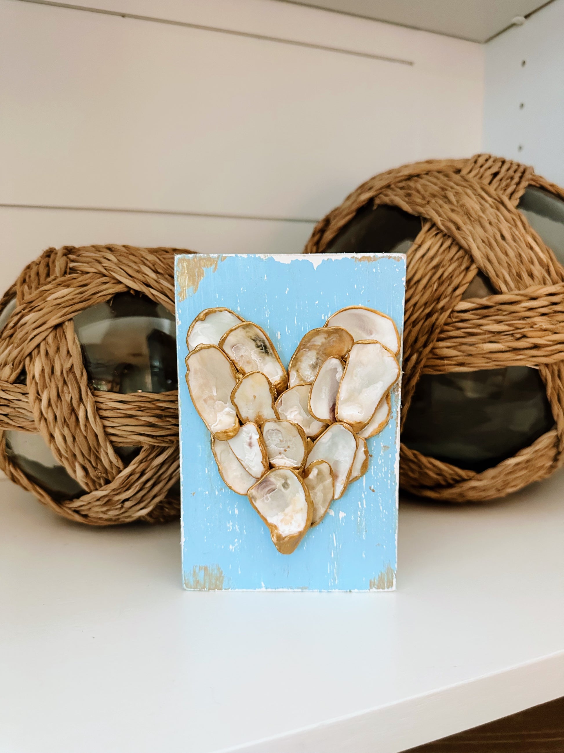 Looking for a unique and eye-catching piece to add to your home decor? Look no Crafted from genuine oyster shells, this heart-shaped decoration is a one-of-a-kind addition to any room. Mounted on a vintage-style blue wood base, this piece features elegant gold accents that catch the light and add a touch of coastal charm.