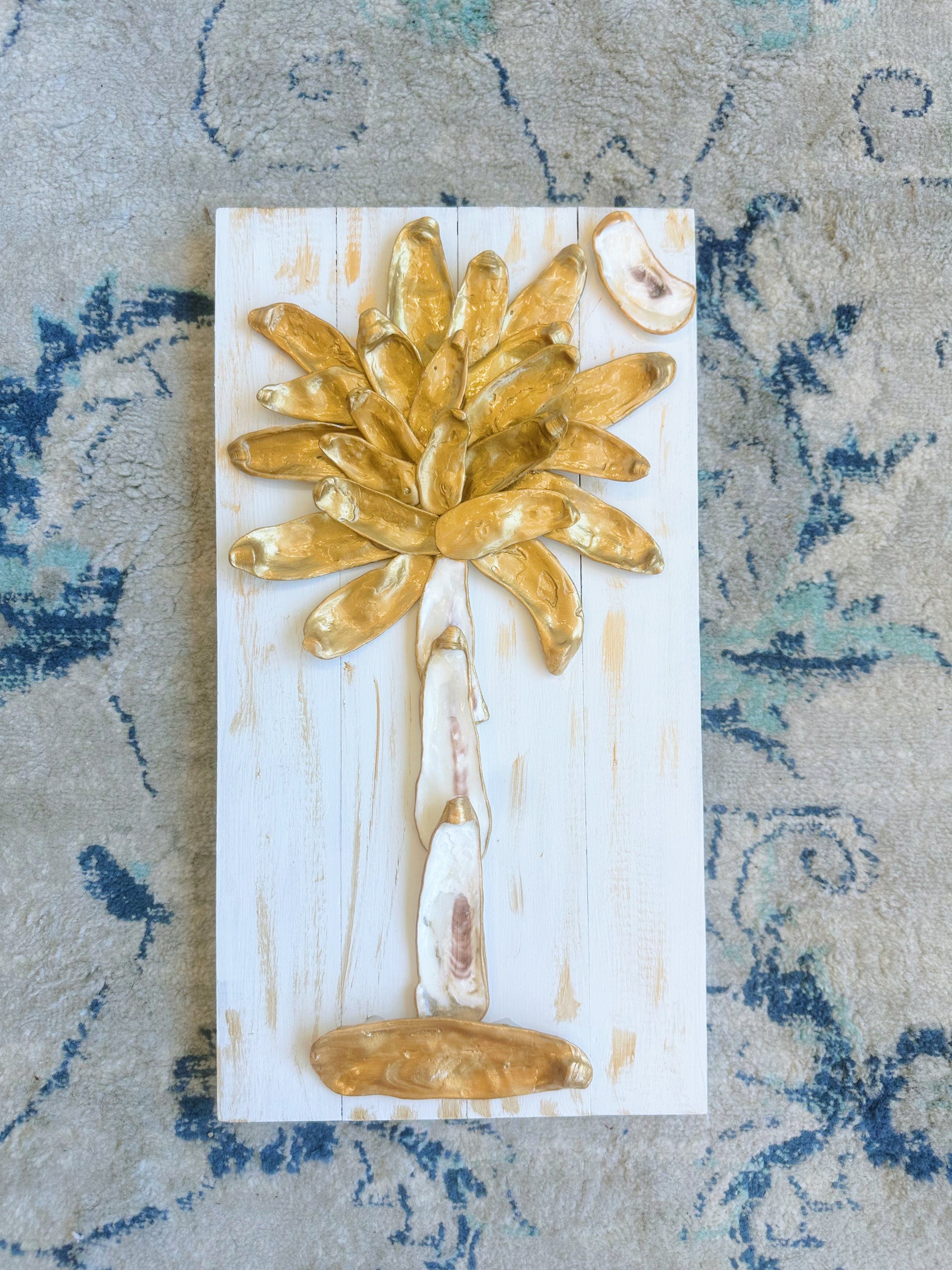 Add a touch of coastal charm to your home with our Oyster Shell Palmetto Tree. Made with real oyster shells on a pallet board, this piece adds a unique and natural element to any room. Perfect for beach lovers or anyone looking to incorporate a bit of the ocean into their decor.